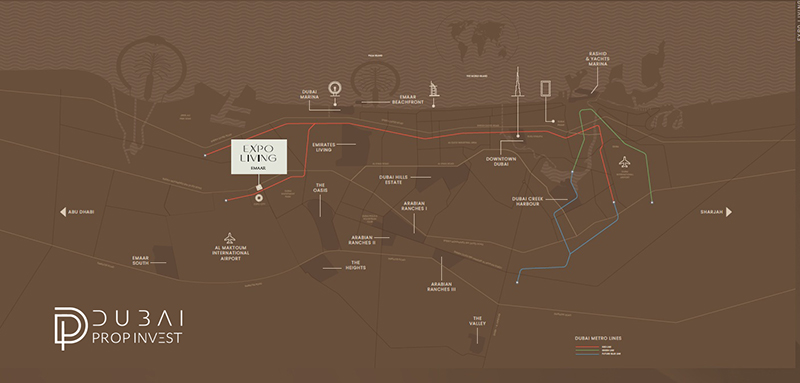 وقتی از لوکیشن اکسپو لیوینگ (Expo Living) صحبت می کنیم، در واقع درباره نقطه ای حرف می زنیم که قلب تپنده دبی آینده است. این کامیونیتی در تقاطع طلایی جاده اکسپو (E77) (Expo Road) و بزرگراه شیخ محمد بن زاید (E311) (Sheikh Mohammed Bin Zayed Road) قرار گرفته و دسترسی های آن به گونه ای است که گویی دسترسی آسان به تمام نقاط شهر خواهید داشت. تصور کنید تنها با چند قدم پیاده روی به ایستگاه متروی اکسپو می رسید یا با یک رانندگی ۱۰ دقیقه ای، خود را در بزرگترین فرودگاه جهان (آل مکتوم) می بینید. این منطقه پل ارتباطی میان دبی و ابوظبی است و به شما این امتیاز را می دهد که بدون درگیر شدن در ترافیک های مرکز شهر، به تمام نقاط استراتژیک دبی از جمله دبی مارینا (Dubai Marina) و پالم جمیرا (Palm Jumeirah) دسترسی داشته باشید.